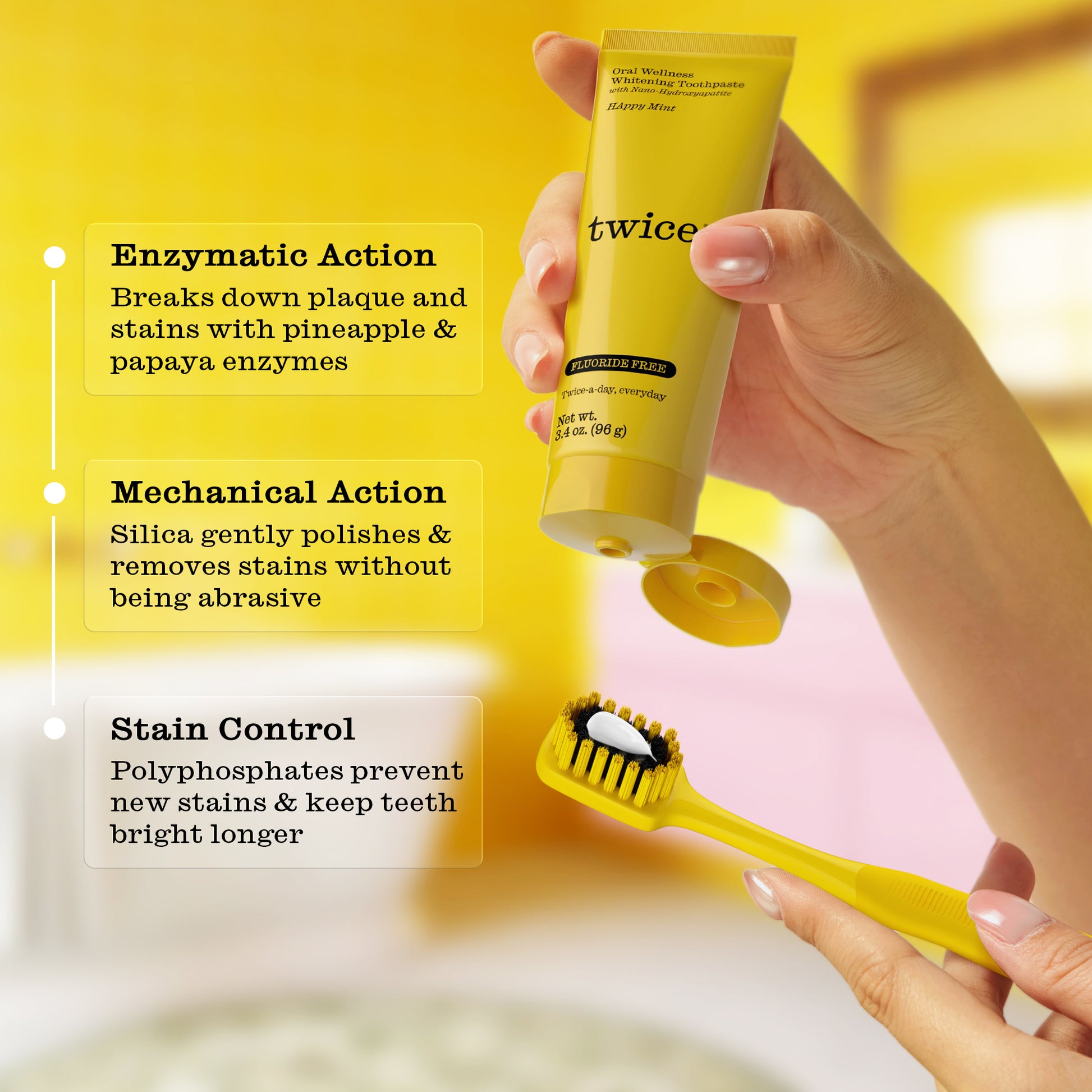 A gentle, fluoride-free whitening toothpaste with 5% nano-hydroxyapatite and enzymes to help lift surface stains while supporting strong, healthy enamel. Clean, vegan-friendly, and safe for daily use.